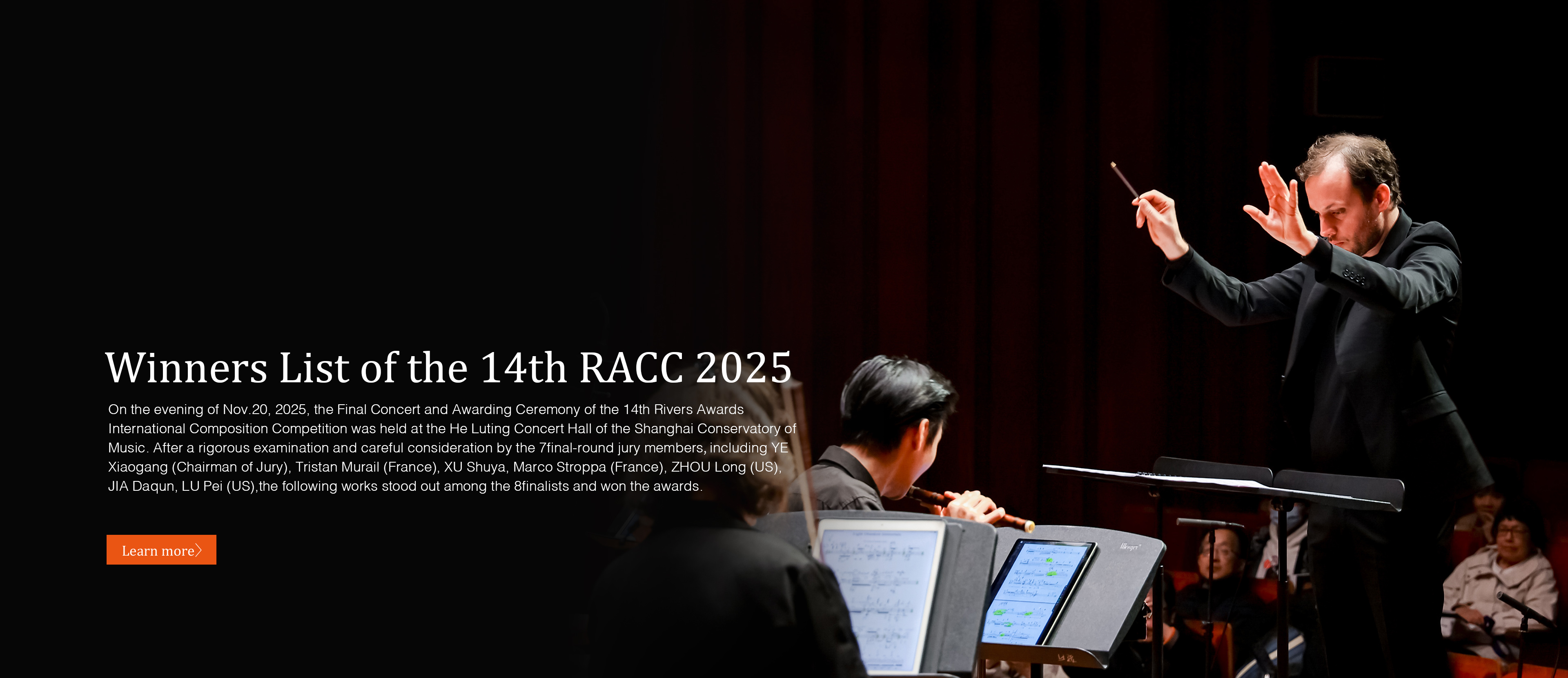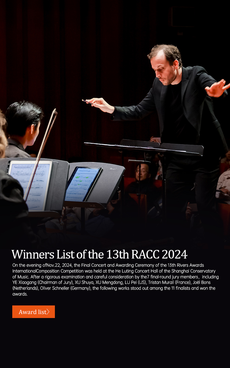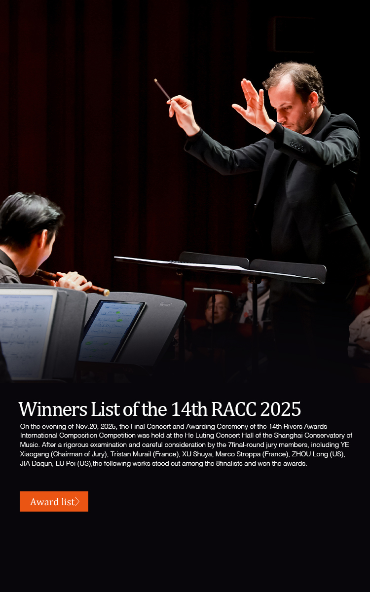 The Rivers Awards International Composition Competition(RACC)aims to facilitate international and domestic exchanges on music and encourages young composers in composing for Chinese and Western instruments.RACC plays a leading role in enabling cooperation between composers and performers, promotes music criticism and cultivates theoretical research in the field of contemporary music. Emphasizing cultural fusion, RACC is distinct from other musical contests both inside and outside of China.